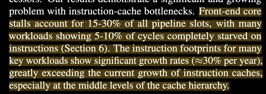 Critically, we (developers) tend to think about algorithmic complexity or d-cache locality, and we even sometimes insert software prefetching for data in order to mitigate this issue. However, if we think about the CPU, the data fetching happens on the backend of the CPU, which has out of order execution2. You can wait for one block of data and fetch another one most of the time, assuming you’re not doing a ton of pointer chasing and have sufficient independent work in the instruction window. However, instructions must be decoded on the frontend, which means that if you stall on fetching instructions, your CPU is definitely not doing anything.